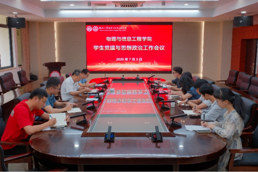 为全面落实立德树人根本任务,推动学院学生党建与思政工作守正创新、提质增效,7月5日上午,物理与信息科学学院在祥联厅会议室召开学生党建与思想政治工作会议。学院党委副书记郑志刚、全体辅导员参加会议,会议全面总结上学期工作成效,系统部署新学期重点任务,为推动学院学生工作高质量发展谋篇布局。